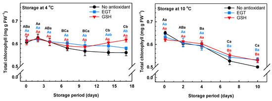 Total chlorophyll in arugula immersed in a pre-storage dip containing either 100 μM ergothioneine (EGT), 500 μM glutathione (GSH), or no antioxidant, and then stored at 4 °C or 10 °C. All total chlorophyll concentrations are expressed on a fresh weight (FW) basis. Each datum represents the mean ± SE of three experimental replicates. Within each plot, uppercase letters denote statistical comparisons within a treatment across the storage period; lowercase letters denote statistical comparisons across the treatments at each postharvest sampling time. Shared letters represent no significant difference between means at p ≤ 0.05.