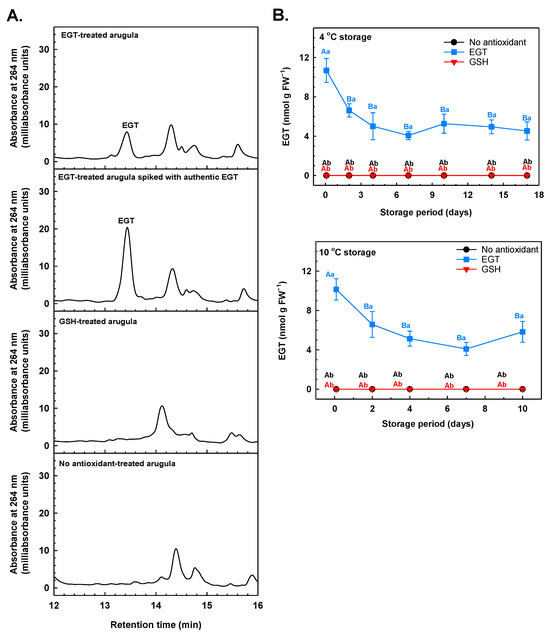 Ergothioneine (EGT) in arugula immersed in a pre-storage dip containing either 100 μM EGT, 500 μM glutathione (GSH), or no antioxidant, and then stored at 4 °C or 10 °C. (A) HPLC–DAD analysis of EGT in extracts prepared from arugula leaves sampled on day 0 of 4 °C storage and within 2 h of their exposure to dip solutions. Chromatograms represent arugula leaves treated with 100 µM EGT prior to storage (top chromatogram); arugula leaves treated with 100 µM EGT prior to storage, and the extract spiked with 3 nmol EGT at the point of HPLC analysis (second chromatogram from top); arugula leaves treated with 500 µM GSH prior to storage (third chromatogram from top); and arugula leaves not treated with antioxidants prior to storage (bottom chromatogram). (B) Alterations in EGT concentrations in arugula leaves as a function of storage period at 4 °C or 10 °C after a pre-storage dip treatment with or without antioxidants. All EGT concentrations are expressed on a fresh weight (FW) basis. Each datum represents the mean ± SE of three experimental replicates. Within each plot, uppercase letters denote statistical comparisons within a treatment across the storage period; lowercase letters denote statistical comparisons across the treatments at each postharvest sampling time. Shared letters represent no significant difference between means at p ≤ 0.05.
