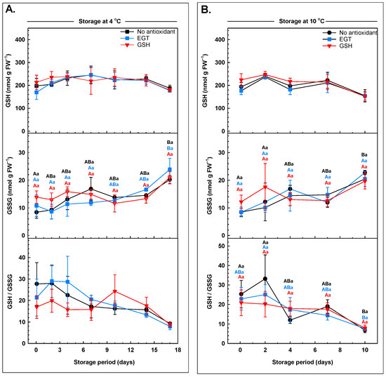 Glutathione profiles (glutathione, GSH; glutathione disulfide, GSSG; and GSH/GSSG ratio) in arugula immersed in a pre-storage dip containing either 100 μM ergothioneine (EGT), 500 μM glutathione (GSH), or no antioxidant, and then stored at 4 °C (A) or 10 °C (B). All glutathione metabolite concentrations are expressed on a fresh weight (FW) basis. Each datum represents the mean ± SE of three experimental replicates. Within each plot, uppercase letters denote statistical comparisons within a treatment across the storage period; lowercase letters denote statistical comparisons across the treatments at each postharvest sampling time. Shared letters represent no significant difference between means at p ≤ 0.05. Plots devoid of statistical lettering represent no significant differences across treatments or their sampling days.