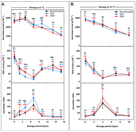 Ascorbate profiles (ascorbate, dehydroascorbate, DHA; and ascorbate/DHA ratio) in arugula immersed in a pre-storage dip containing either 100 μM ergothioneine (EGT), 500 μM glutathione (GSH), or no antioxidant, and then stored at 4 °C (A) or 10 °C (B). All ascorbate metabolite concentrations are expressed on a fresh weight (FW) basis. Each datum represents the mean ± SE of three experimental replicates. Within each plot, uppercase letters denote statistical comparisons within a treatment across the storage period; lowercase letters denote statistical comparisons across the treatments at each postharvest sampling time. Shared letters represent no significant difference between means at p ≤ 0.05.