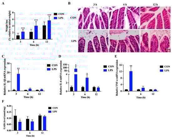 The changes of GABA level during LPS-induced intestinal inflammation. (A) The amount of weight loss was quantified for both the control (CON) and LPS-treated (LPS) groups at various time points. (B) Representative images display H&E-stained cross-sections of the ileum from both the CON and LPS groups at specific time intervals, with a 50 μm scale bar provided. (C–E) The expression levels of IL-1β, IL-6, and TNF-α mRNAs were determined through qRT-PCR analysis of mouse intestinal tissue samples collected at different times. GAPDH served as the reference gene for data normalization, and the relative fold changes in expression compared to the CON group were computed using the 2−ΔΔCT method. (F) The levels of GABA in ileal tissue were measured using UHPLC-MS/MS at 3, 6, and 12 h post-treatment. The presented data are the mean ± SD. * indicates that the difference between the CON and the LPS is significant (p < 0.05). ** or *** indicates that the difference between the CON and the LPS is extremely significant (p < 0.01 or p < 0.001).