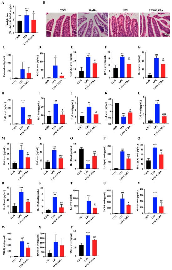GABA attenuates intestinal mucosa injury by improving inflammatory factor expression in LPS-induced mice. (A) To determine weight loss, the body weights of mice were measured and compared to their initial weights at the commencement of LPS treatment. The results are presented for untreated mice (CON), mice subjected to LPS treatment (LPS), and mice treated with GABA following LPS induction (LPS + GABA). (B) Ileal tissues from various groups, including the control (CON), mice treated solely with GABA (GABA), mice treated with LPS, and mice treated with both LPS and GABA, were stained with H&E. The scale bar represents 50 μm. (C–Y) Inflammatory cytokines in ileal tissues were analyzed using Luminex liquid suspension chip detection. The data are presented as the mean ± SD. Statistical significance is denoted as follows: * represents a significant difference between the CON and LPS groups (p < 0.05), while ** or *** signifies an extremely significant difference (p < 0.01 or p < 0.001). Differences between the LPS and LPS + GABA groups are marked with # for significant (p < 0.05) and ## or ### for extremely significant differences (p < 0.01 or p < 0.001).