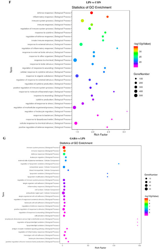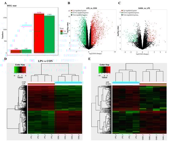 Transcriptome analysis of LPS-induced mice after GABA administration. (A) Total number of up- or downregulated genes of significant DEGs. (B,C) Volcano plot illustrating differentially regulated gene expression from RNA-seq analysis between LPS and CON, GABA and LPS, respectively. Genes upregulated and downregulated are shown in red and green, respectively. (D,E) Differential gene expression heat maps of mice between LPS and CON, GABA and LPS, respectively. (F,G) GO analysis showed the top 30 of enriched signaling in ileal tissues between LPS and CON, GABA and LPS, respectively. (H,I) KEGG analysis showed the top 30 of enriched signaling in ileal tissues between LPS and CON, GABA and LPS, respectively. CON: control group; LPS: LPS group; GABA: LPS + GABA treatment group.