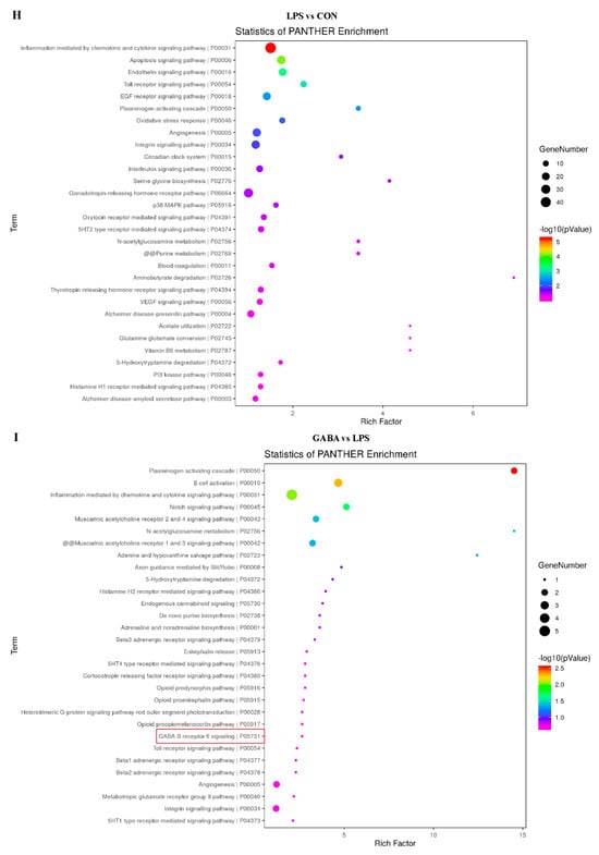 To further confirm the underlying GABA mechanisms in mitigating intestinal damage in LPS-induced mice, we performed RNA sequencing of ileal tissues. The results showed that, in comparison to the CON group, the LPS group exhibited 3268 differentially expressed genes (Figure 3A,B). Specifically, 1679 genes were upregulated, while 1589 genes were downregulated. When compared to the LPS group, the LPS + GABA group demonstrated 271 differentially expressed genes, with 130 genes upregulated and 141 genes downregulated (Figure 3A,C). Hierarchical clustering analysis uncovered substantial disparities in gene expression patterns between the LPS and CON groups, as well as between the LPS + GABA and LPS groups (Figure 3D,E). GO enrichment and KEGG signaling pathway analyses were conducted on these differentially expressed genes. Among the top 30 most significant GO enrichment pathways, defense response, inflammatory response, and immune system processes stood out in the LPS versus CON group comparison (Figure 3F). In contrast, immune system processes, immune responses, and defense responses were more prominent in the comparison between the LPS + GABA and LPS groups (Figure 3G). An examination of the 30 most notable KEGG signaling pathways revealed that inflammation mediated by chemokine and cytokine signaling, apoptosis signaling, and endothelin signaling were more pronounced in the LPS versus CON group (Figure 3H). On the other hand, plasminogen activating cascade, B-cell activation, and inflammation mediated by chemokine, and cytokine signaling were more significant in the comparison between the LPS + GABA and LPS groups (Figure 3I). Furthermore, our findings indicated that exogenous GABA administration significantly enriched GABABR signaling (Figure 3I, as denoted by the red box). Collectively, these results suggest that through activation of GABABR, GABA could regulate LPS-induced intestinal inflammation at the gene expression level.