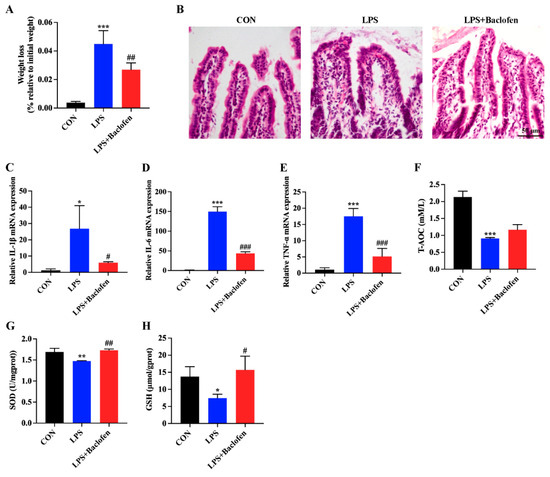 GABABR activation could reduce the levels of inflammatory cytokine and oxidative stress in LPS-induced mice. (A) To assess weight loss, the body weights of mice were measured and compared to their weights recorded at the start of LPS treatment. The presented results cover untreated mice (CON), mice treated with LPS, and mice treated with Baclofen following LPS induction (LPS + Baclofen). (B) Ileal tissues from the CON, LPS, and LPS + Baclofen mice groups underwent H&E staining. The scale bar represents 50 μm. (C–E) qRT-PCR was employed to determine the mRNA levels of IL-1β, IL-6, and TNF-α, with GAPDH serving as the reference gene. The average fold changes compared to the CON group were calculated using the 2−ΔΔCT method. (F–H) The graphs depict the expression levels of T-AOC, SOD, and GSH in ileal tissues. Data are presented as mean ± SEM. Statistical significance is denoted by asterisks: * for significant differences between CON and LPS (p < 0.05), ** or *** for extremely significant differences (p < 0.01 or p < 0.001). # indicate significant differences between the LPS and LPS + Baclofen groups, with # for significant (p < 0.05) and ## or ### for extremely significant differences (p < 0.01 or p < 0.001).