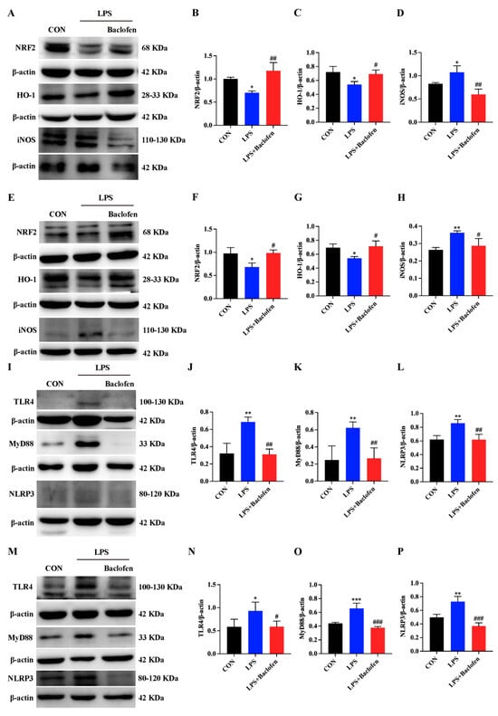 GABABR activation could ameliorate oxidative stress by inhibiting TLR4/MyD88/NLRP3 in vivo and in vitro. (A–D) WB analysis of the expression of NRF2, HO-1, and iNOS in ileal tissues of mice. (E–H) WB analysis of the expression of NRF2, HO-1, and iNOS in IPEC-J2 cells. (I–L) WB analysis of the expression of TLR4, MyD88, and NLRP3 in ileal tissues of mice. (M–P) WB analysis of the expression of TLR4, MyD88, and NLRP3 in IPEC-J2 cells. For WB, protein expression was normalized against β-actin. Data are presented as mean ± SEM. Statistical significance is denoted by asterisks: * for significant differences between CON and LPS (p < 0.05), ** or *** for extremely significant differences (p < 0.01 or p < 0.001). # indicate significant differences between the LPS and LPS + Baclofen groups, with # for significant (p < 0.05) and ## or ### for extremely significant differences (p < 0.01 or p < 0.001).