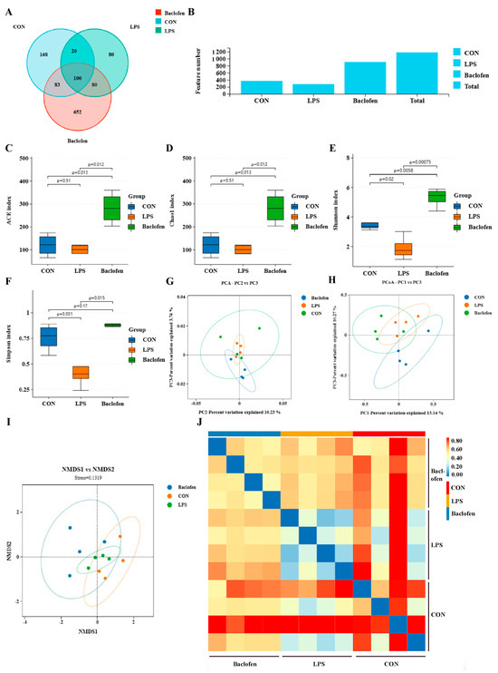 Diversity indexes of microbiota in the mice intestine. (A) Venn diagram of the number of OTUs. (B) OTU number histogram. (C–F) α-diversity analyzed by ACE, Chao1, Shannon and Simpson indices. (G–J) Principal component, principal coordinates, NMDS and sample clustering heat map analyses of gut microbiota of each group. CON: control group; LPS: LPS group; Baclofen: LPS + Baclofen treatment group.