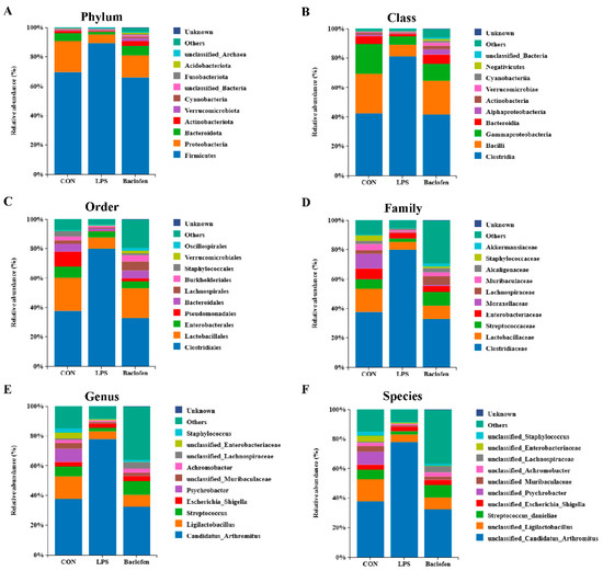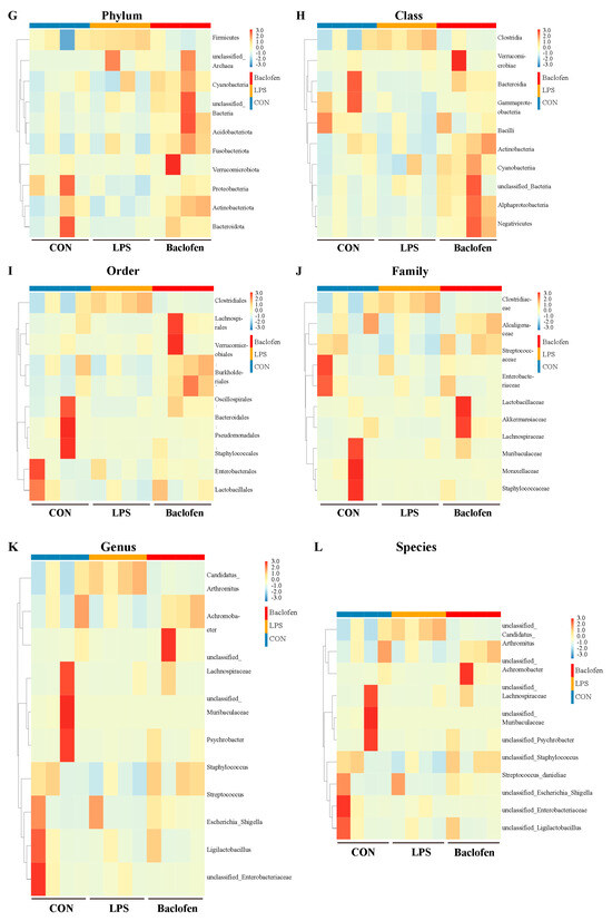 Analysis of the microbial composition. (A–F) 16S rDNA sequencing results of relative abundance of intestinal bacteria in mice at phylum, class, order, family, genus, and species levels in each group. (G–L) Cluster heatmap of species abundance in each group. CON: control group; LPS: LPS group; Baclofen: LPS + Baclofen treatment group.