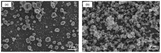 SEM images of fish oil-loaded capsules (13 wt% fish oil) produced by monoaxial electrospraying. K-FO sample (a); Z-FO sample (b).