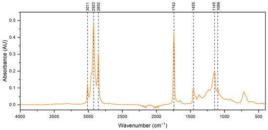 The FTIR spectrum of fish oil (Figure 3) exhibits a triplet band at 2800–3000 cm−1, which is attributed to the C–H stretching modes of the methyl and methylene backbone of lipids [44,45]. A band at 3011 cm−1 corresponds to the C–H stretching of cis–alkene–HC=CH– from unsaturated fatty acids. The sharp band at 2923 cm−1 is attributed to methylene (CH2) groups, and the band at 2852 cm−1 represents methyl (CH3) (both symmetrical stretching). Another sharp band at 1742 cm−1 is assigned to the C=O stretch of the ester functional group from ethyl esters of lipids and fatty acids. The band at 1455 cm−1 is assigned to the asymmetrical deformation scissor from methylene (CH2). The band at 1145 cm−1 is attributed to CH2 out-of-plane deformation modes, and a small band at 1099 cm−1 is assigned to C–O–C symmetrical stretches [44,46,47].