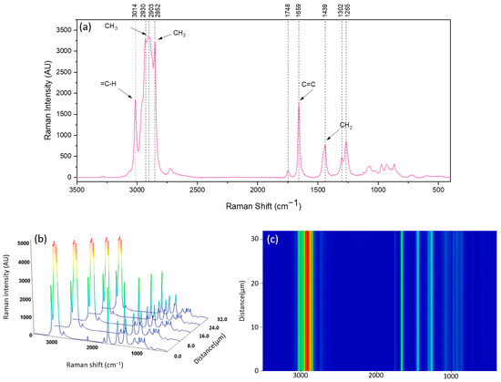 The Raman spectrum of free fish oil (FO) and a 3D image of line mapping across about 30µm of FO and its counter map image are shown in Figure 5. In the region ranging between 3000 and 2800 cm−1, several bands can be seen associated with the C–H stretching vibrations. The peak observed at 3014 cm−1 corresponds to the stretching of =C–H (of cis–HC=C–H) groups [46]. The band at 2930–2903 cm−1 is associated with CH3 groups, while the peak at 2852 cm−1 is assigned to CH2 groups [50]. The peak at 1748 cm−1 contributes to the C=O stretch, the peak at 1659 cm−1 is related to the stretching vibration of the C=C stretch, and the peak around 1439 cm−1 signifies the CH2 scissoring groups. Furthermore, the peaks at 1302 cm−1 and 1265 cm−1 are assigned to CH2 bending and symmetric =C–H rock (=C–H deformation), respectively [32,51,52]. As expected, the spectra of fish oil across the line mapping show the same peaks with the same intensity (Figure 5b,c).