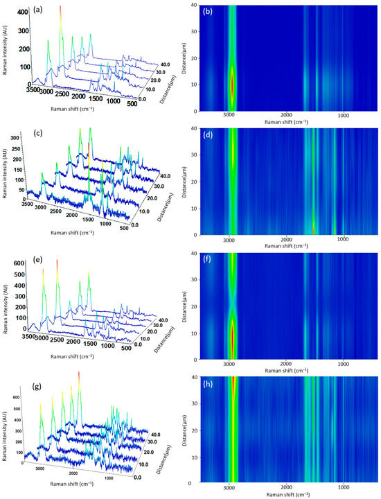 Three-dimensional image spectra from line-scanning Raman mapping across the surface of the electrosprayed (a) kafirin control (K-NFO), (c) zein control (Z-NFO), (e) fish oil-loaded kafirin (K-FO), (g) fish oil-loaded zein capsules (Z-FO); and (b,d,f,h) corresponding contour map images.