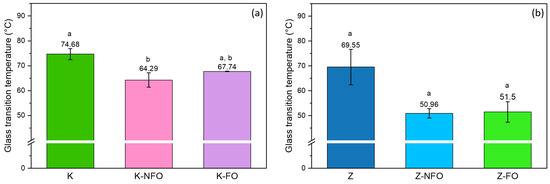 Glass transition temperature of (a) kafirin samples and (b) zein samples. Different superscript letters indicate significant differences (p < 0.05) among the samples.