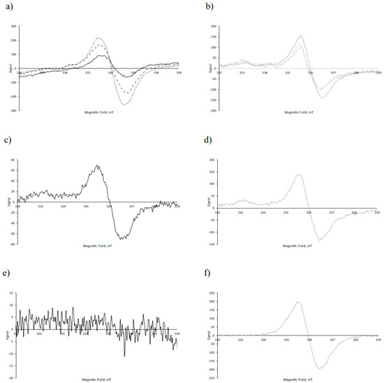 EPR spectra of protein samples at day 0: (a) kafirin capsules loaded with fish oil (K-FO), (b) zein capsules loaded with fish oil (Z-FO), (c) kafirin capsules without fish oil (K-NFO), (d) zein capsules without fish oil (Z-NFO), (e) kafirin protein powder (Z), and (f) zein protein powder (Z). In (a,b), day 0 (solid line), day15 (dashed line), and day 25 (dotted line).