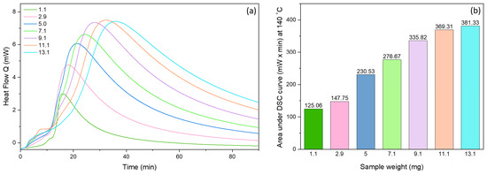 Figure 9 shows the DSC oxidation curves for the non-encapsulated fish oil at different magnitudes (1–13 ± 0.1 mg) at an isothermal temperature of 140 °C. A large exothermic peak is clearly shown, which considerably increases as the quantity of the sample increases. The area under the isothermal curve can be used to quantify and compare the oxidative stability of the oil [32,33,34]. The area under the isothermal curve for 13.1 mg oil was nearly three-fold higher (381.33 mW × min) in comparison to the area of the 1.1 mg oil (125.06 mW × min).
