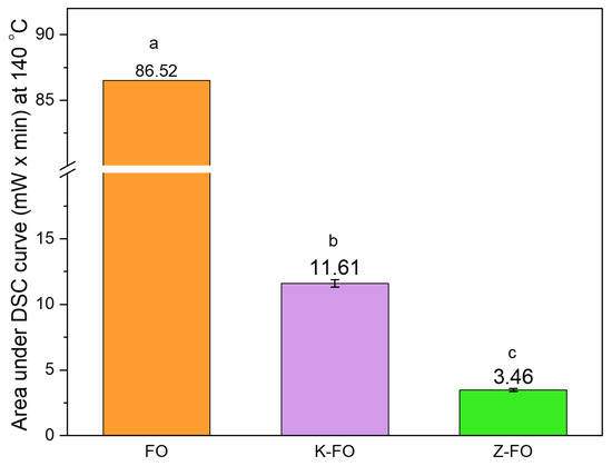 Isothermal DSC results at 140 °C and oxygen flow of 50 mL/min. Area under the isothermal oxidation curve for non-encapsulated FO, fish oil-loaded kafirin, and fish oil-loaded zein nanocapsules. Different superscript letters indicate significant differences (p < 0.05) among the samples.