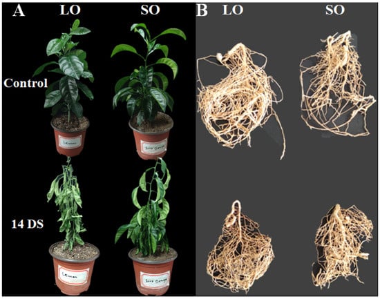 Symptoms of drought stress in citrus species. (A) Control plants (without stress) and 14 days of drought stress in lemon and sour orange plants showing drought symptoms on the leaves; (B) control roots (without stress) and drought stress symptoms on the LO and SO roots. Abbreviations: 14 DS: 14 days of drought stress, LO: lemon, SO: sour orange.