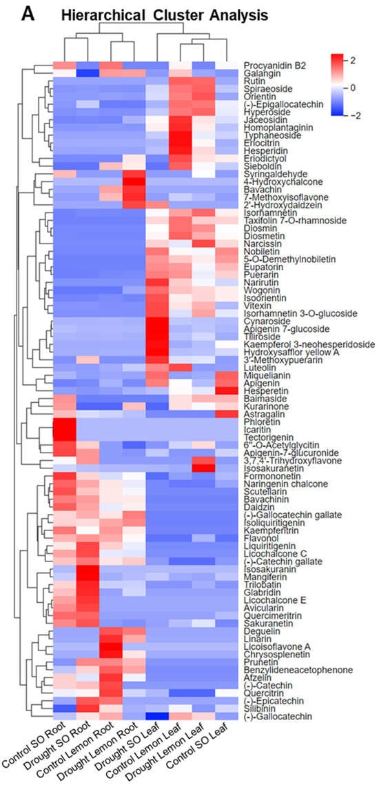 The heatmap illustrates the relative abundance of various flavonoid compounds in different sour orange and lemon samples, specifically focusing on the roots and leaves. Each row corresponds to a distinct flavonoid compound and each column represents different species subjected to drought stress treatment in terms of both root and leaf tissues. Notably, the column dendrograms reveal that SO and lemon root samples cluster separately. Specifically, SO roots exhibit a distinct flavonoid profile compared to that of lemon roots (Figure 2A). Post-drought stress, the flavonoid profile of SO leaves displays a unique pattern, not clustering with any other sample group and demonstrating a distinct abundance of flavonoid compounds, as shown in the hierarchical cluster analysis (Figure 2A).