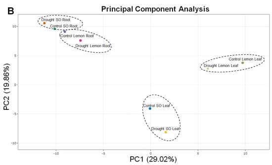 Principal component analysis was employed to investigate the variation in flavonoid compound abundance across different species and drought stress treatment groups. The first principal component (PC1) accounted for 29.02% of the total variance, while the second principal component (PC2) explained 19.86%, as depicted in Figure 2B. The distribution along the PC1 axis indicates a notable differentiation in the flavonoid profiles between the samples positioned on the right side (drought-stressed lemon leaf, control lemon leaf) and those on the left side (control SO root, drought-stressed SO root, control lemon root, drought-stressed lemon root). Additionally, the separation along the PC2 axis clearly distinguishes the flavonoid profiles of sour orange leaves from those of lemon roots, sour orange roots, and lemon leaves. The PCA plot reveals distinct clustering patterns among the species and drought stress treatment groups in both roots and leaves, highlighting variations in the flavonoid compound profiles.