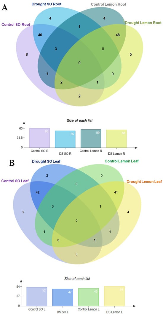 Venn intersection analyses of sour orange and lemon flavonoids. (A) Venn intersection analyses of sour orange and lemon root flavonoids; (B) Venn intersection analyses of sour orange and lemon leaf flavonoids. Abbreviations: R: root, L: leaf, DS: drought stress, SO: sour orange.