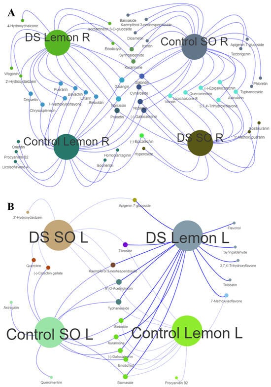 Venn interactive networks of sour orange and lemon flavonoids. (A) Venn interactive network of sour orange and lemon root flavonoids; (B) Venn interactive network of sour orange and lemon leaf flavonoids. Abbreviations: R: root, L: leaf, DS: drought stress, SO: sour orange.
