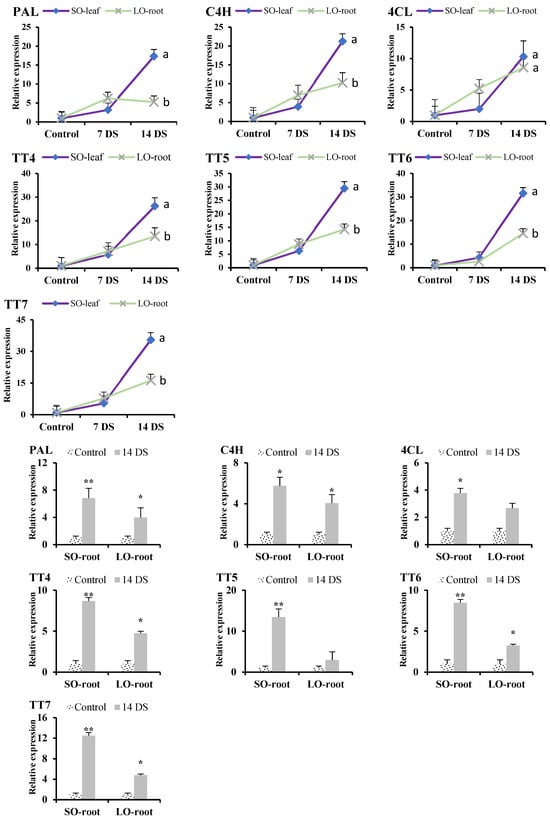 Expression analysis of citrus root and leaf flavonoid biosynthesis genes under drought stress. Abbreviations: SO: sour orange (SO), LO: lemon, PAL: phenylalanine ammonia-lyase; C4H: cinnamate 4-hydroxylase, 4CL: 4-coumarate: coenzyme A ligase, TT4: transparent testa 4, TT5: transparent testa 5, TT6: transparent testa 6, TT7: transparent testa 7. Each figure represents the mean of 3 replications and the bars signify the standard error. The least significant difference (LSD) was used at p < 0.05 (a,b), whereas for the root data, Student’s t-test was used to compare the control and drought treatment at * p < 0.05 and ** p < 0.01.