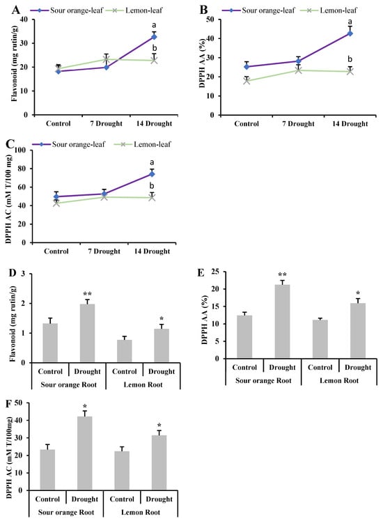 Flavonoid content and DPPH activity and capacity in citrus leaf and root samples under drought stress. (A) Total flavonoid content in leaf samples, (B) leaf DPPH antioxidant activity, (C) leaf DPPH antioxidant capacity, (D) root total flavonoid content, (E) root DPPH antioxidant activity (%), (F) root DPPH antioxidant capacity. Abbreviations: DPPH: 2,2-diphenyl-1-picrylhydrazyl; AA: antioxidant activity; AC: antioxidant capacity; 7 Drought: 7 days of drought stress; 14 Drought: 14 days of drought stress. Each figure represents the mean of 3 replications and the bars signify the standard error. The least significant difference (LSD) was used at p < 0.05 (a,b), whereas for the root data, Student’s t-test was used at * p < 0.05 and ** p < 0.01.