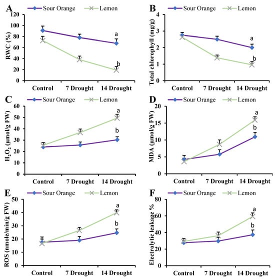 Drought stress effects on citrus leaf biochemical parameters. (A) Relative water content, (B) total chlorophyll content, (C) H2O2 content, (D) malondialdehyde content, (E) reactive oxygen species, (F) electrolytic leakage. Abbreviations: RWC: relative water content; H2O2: hydrogen peroxide; MDA: malondialdehyde; ROS: reactive oxygen species; FW: fresh weight; 7 Drought: 7 days of drought stress; 14 Drought: 14 days of drought stress. Each figure represents the mean of 3 replications and the bars signify the standard error. The least significant difference (LSD) was used at p < 0.05 (a,b).