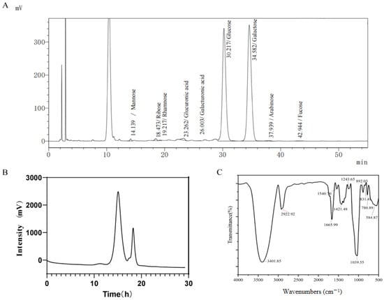The structural composition of L. bulgaricus 1.0207 EPS. (A) Results of the determination of the monosaccharide composition of EPS by HPLC; (B) Results of molecular weight determination of EPS by GPC; (C) Evaluation of characteristic groups and glycosidic bonds in EPS molecules by FT-IR.