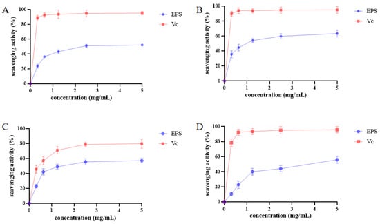 The DPPH radical scavenging activity was determined using the Zhao et al. method []. Specifically, 1 mL of different concentrations of EPS sample solution (0.5–4 mg/mL) was added to 2.0 mL of a 0.05 mM DPPH ethanol solution. The mixture was thoroughly combined and incubated for 30 min at room temperature, protected from light. The control group comprised deionized water and DPPH solution, while the blank group consisted of ethanol and sample solution. After centrifugation at 8000 rpm for 10 min, the absorbance of three replicate samples was measured at 517 nm. In the assays, vitamin C (Vc) was used as the positive control due to its known antioxidant properties [], serving as a benchmark for evaluating the antioxidant capacity of the EPS samples.
