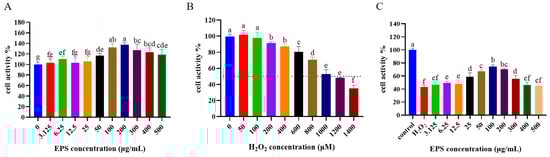 Effect of different EPS and H2O2 concentrations on the activity of IPEC-J2 cells as determined by CCK-8 dye. (A) effect of different concentrations of EPS on cell activity; (B) effect of different concentrations of H2O2 on cell activity; (C) effect of different EPS concentrations on cell activity recovery after oxidative stress caused by H2O2. Different lowercase letters indicate significant differences between groups (p < 0.05).