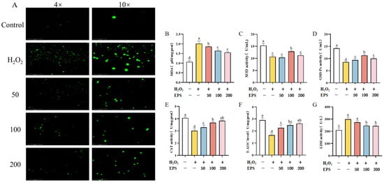 The accumulation of H2O2 in the cell would affect the antioxidant capacity of the cell. ROS within the cells exhibited a green fluorescent signal under DCFH-DA staining conditions. A large range of green fluorescence was observed in the cells of the H2O2 group compared to the control group (Figure 4A). The area of green fluorescence notably decreased in the 50, 100, and 200 μg/mL EPS groups compared to the H2O2 group (p < 0.05). Figure 4B–G showed the effect of various treatments on the antioxidant enzyme activities in each group of cells. The activities of SOD, GSH-Px, CAT, and T-AOC were significantly reduced in the cells following H2O2 treatment when compared to the group without the addition of H2O2 and EPS (p < 0.05). Meanwhile, both cellular MDA and LDH levels in cell supernatants were significantly increased (p < 0.05). There were significantly improved cellular antioxidant enzyme activities in cells treated with EPS for 12 h when compared to the groups only with the addition of H2O2 (p < 0.05). Moreover, concentrations of 100 μg/mL and 200 μg/mL EPS demonstrated significantly greater improvements compared to 50 μg/mL (p < 0.05). There was no significant difference between the effects of 100 μg/mL and 200 μg/mL EPS (p > 0.05).