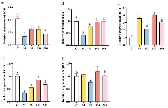 Effect of EPS on the expression of antioxidant genes in oxidatively stressed IPEC-J2 cells detected by qPCR. (A) Relative expression of SOD mRNA; (B) Relative expression of CAT mRNA; (C) Relative expression of HO-1 mRNA; (D) Relative expression of GPX mRNA; (E) Relative expression of NQO1 mRNA. Different lowercase letters indicate significant differences between groups (p < 0.05).