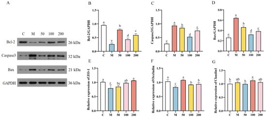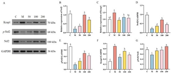 The expression levels of related proteins in the Keap1/Nrf2 signaling pathway and key regulators of cell apoptosis were determined using western blotting. Total cellular proteins were extracted for western blotting analysis using the method of Guan []. Protein concentration was determined with a BCA kit (Meilun Bio, Dalian, China). Protein separation was performed by SDS-PAGE and transferred to PVDF membranes, blocked for 1–1.5 h. Membranes were incubated overnight with primary antibodies at 4 °C and washed with TBST three times. After that, diluted secondary antibody was added for incubation at room temperature for 30 min and then washed with TBST four times. Finally, the optical density of the target strip was analyzed by the Gel-Pro Analyzer version 4.0 software.