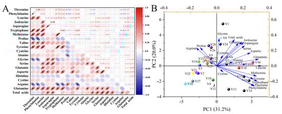 Figure 1. (A) Pearson’s correlation analysis and (B) principal component analysis of amino acids in different eggplant varieties. Data are mean values (n = 3). * indicates a significant correlation (p < 0.05) (two-tailed). V1–V30 represent 30 different Chinese eggplant varieties.