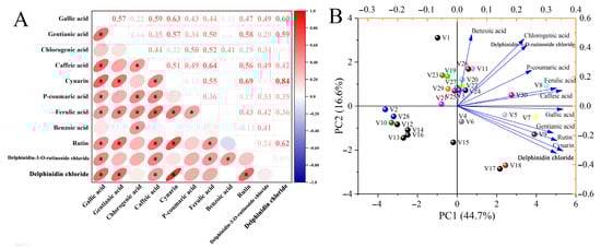 Figure 2. (A) Pearson’s correlation analysis and (B) principal component analysis of polyphenol and anthocyanin components in different eggplant varieties. Data are mean values (n = 3). * indicates a significant correlation (p < 0.05) (two-tailed). V1–V30 represent 30 different Chinese eggplant varieties.