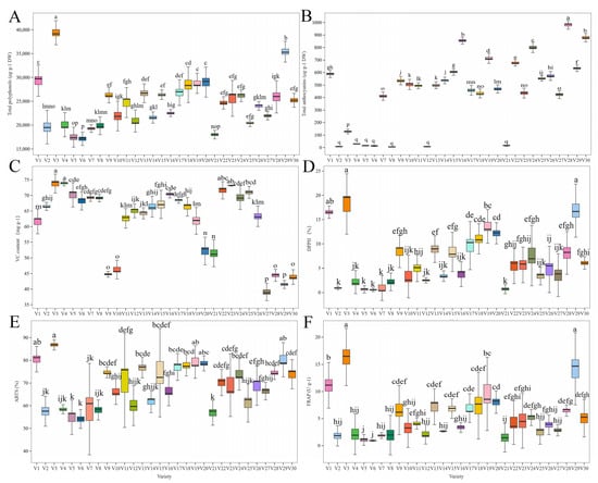 Figure 3. Difference analysis of (A) total polyphenols, (B) total anthocyanins, (C) vitamin C (VC), (D) 2,2-diphenyl-1-picrylhydrazyl (DPPH), (E) 2,2’-azino-bis(3-ethylbenzothiazoline-6-sulfonic acid) (ABTS), and (F) ferric-reducing antioxidant power (FRAP) in 30 eggplant varieties. Different lowercase letters represent significant differences (p < 0.05). V1–V30 represent 30 different Chinese eggplant varieties.
