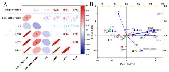 Figure 4. (A) Pearson’s correlation analysis and (B) principal component analysis of antioxidants and antioxidant capacity in different eggplant varieties. Data are mean values (n = 3). * represents a significant correlation (p < 0.05) (two-tailed). V1–V30 represent 30 different Chinese eggplant varieties.