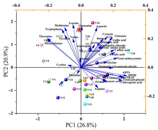 Figure 5. Principal component analysis of amino acids, polyphenols, anthocyanins, VC and antioxidant capacity of different eggplant varieties. V1–V30 represent 30 different Chinese eggplant varieties.