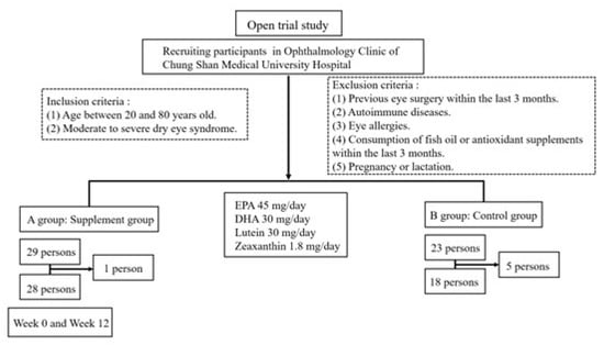 This study was an open-label intervention trial. The participants were randomly assigned to control and supplement (45 mg/day EPA, 30 mg/day DHA, 30 mg/day lutein, and 1.8 mg/day zeaxanthin) (Far East Bio-Tec Co., Ltd., Taipei City, Taiwan) groups. Supplementation was administered for 12 weeks. Each participant had two visits (weeks 0 and 12) throughout the study period. To assure compliance with the intervention, the participants were asked to return their bottles for capsule counts. In addition, the study co-executor made phone calls to remind each participant to take the capsules every week during the intervention period. A participant would be excluded if their compliance was <80%. In a previous study, the supplement group exhibited a significant increase in tear break-up time (TBUT) of 4.6 s (p < 0.05) compared with the control group [33]. We subsequently calculated the sample size based on the detection of a significant 4.6 s increase between two groups with a power of 80% and a two-sided test with an α value of 0.05. A total of 42 patients were required to match the calculation criteria. The final recruitment number was 52 patients, exceeding our original calculation.