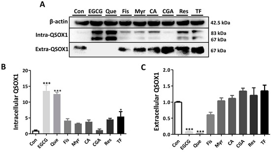 Influence of dietary polyphenols on intra- and extracellular QSOX1 in HepG2 cells. HepG2 cells were treated with polyphenol at IC50 for 48 h. (A) Western blot to confirm intra- and extracellular QSOX1 expression levels. (B) Quantification of intracellular QSOX1 levels in Western blot. (C) Quantification of extracellular QSOX1 levels in Western blot. Data are presented as mean ± SEM (n = 3). Compared to the control, * p < 0.05 and *** p < 0.001.