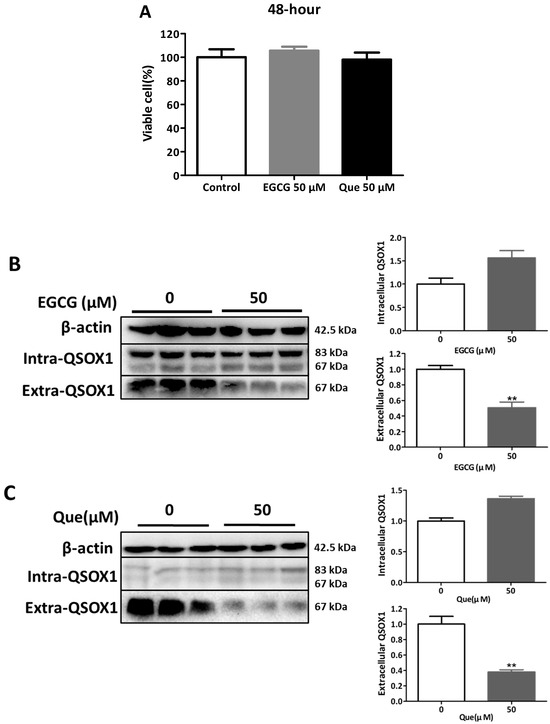 Influence of EGCG and Que on intra- and extracellular QSOX1 of HepG2 cells in non-cytotoxic conditions. HepG2 cells were treated with EGCG (50 μM) or Que (50 μM) for 48 h. (A) Cell viability; (B) QSOX1 protein following treatment with EGCG; (C) QSOX1 protein following treatment with Que. Data are presented as mean ± SEM (n = 6 in (A); n = 3 in (B,C)). Compared to the control, ** p < 0.01.