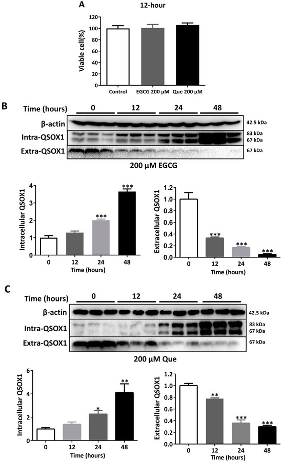 It was found that 50 μM EGCG significantly inhibited the secretion of AFP in HepG2 cells and induced the intracellular aggregation of AFP [19]. In our study, treatments with 50 μM EGCG or Que for 48 h did not affect the viability of HepG2 cells (Figure 3A) but did significantly inhibit extracellular QSOX1 (Figure 3B,C). Treatments with 200 μM EGCG or Que for 12 h did not affect the cell viability of HepG2 cells (Figure 4A) but did significantly inhibit extracellular QSOX1 (Figure 4B,C). Moreover, treatments with 50 μM EGCG or Que for 48 h and treatment with 200 μM EGCG or Que for 12 h significantly inhibited extracellular QSOX1, although none of them affected the viability of Huh7 cells (Figure 5 and Figure 6). These results derived from non-cytotoxic conditions suggest that EGCG and Que are able to reduce the secretion of QSOX1 from human HCC cells. As a result of secretion inhibition seen at 12 h, we observed that intracellular QSOX1 accumulated in a time-dependent manner (24–48 h) in HepG2 cells (Figure 4B,C) and Huh7 cells (Figure 6B,C).