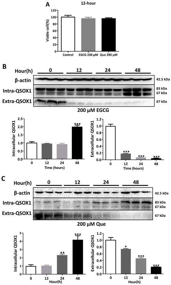 Time course of QSOX1 alterations subjected to EGCG or Que treatment in Huh7 cells. (A) Cell viability after treatment with EGCG or Que for 12 h; (B) Huh7 cells treated with 200 μM EGCG for 0, 12, 24, or 48 h; (C) Huh7 cells treated with 200 μM Que for 0, 12, 24, or 48 h. Data are presented as mean ± SEM (n = 6 in (A); n = 3 in (B,C)). Compared to the control, * p < 0.05, ** p < 0.01, and *** p < 0.001.