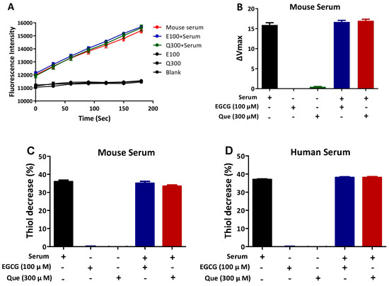 Influence of EGCG or Que on QSOX1 activity. EGCG (100 μM) or Que (300 μM) was incubated with serum at 37 °C for 2 or 3 h. (A,B) QSOX1 activity of mouse serum (3 min incubation) assessed via fluorescence-based assay; (C) DOC activity of mouse serum (15 min incubation) assessed via colorimetric assay; (D) DOC activity of human serum (15 min incubation) assessed via colorimetric assay. Data are presented as mean ± SEM (n = 3).
