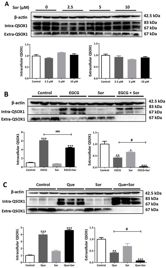 Influence of sorafenib (Sor) on QSOX1 in HepG2 cells. (A) Dose effect of sorafenib after 48 h of treatment; (B) influence of sorafenib (5 μM) plus EGCG (200 μM) on QSOX1 after 48 h of treatment; (C) influence of sorafenib (5 μM) plus Que (200 μM) on QSOX1 after 48 h of treatment. Data are presented as mean ± SEM (n = 3). Compared to the control, * p < 0.05, ** p < 0.01, and *** p < 0.001; compared to EGCG or Que, # p < 0.05 and ### p < 0.001.
