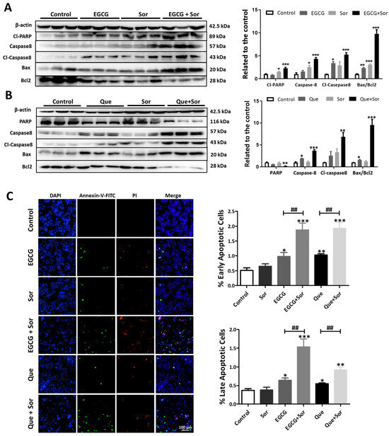 Influence of sorafenib (Sor), EGCG, Que, or their combinations on apoptosis in HepG2 cells. HepG2 cells were treated with EGCG (200 μM), Que (200 μM), sorafenib (5 μM), or their combination for 48 h. (A,B) Apoptosis-associated proteins; (C) early and late apoptosis, as indicated by high-content cell imaging. Data are presented as mean ± SEM (n = 3). Compared to the control, * p < 0.05, ** p < 0.01, and *** p < 0.001; compared to EGCG or Que, ## p < 0.01.