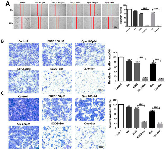 Influence of sorafenib (Sor), EGCG, Que, or their combination on migration and invasion of Huh7 cells. Huh7 cells were treated with EGCG, Que, sorafenib, or their combination for 48 h. (A) Migration of Huh7 cells treated with the drug at indicated concentrations for 48 h by wound healing assay; (B) effect of EGCG or Que in combination with Sor on Huh7 cell migration determined by Transwell assay; (C) effect of EGCG or Que in combination with Sor on Huh7 cell invasion determined by Transwell assay. Data are presented as mean ± SEM (n = 3). Compared to the control, * p < 0.05, *** p < 0.001; compared to the EGCG or Que, ### p < 0.001.