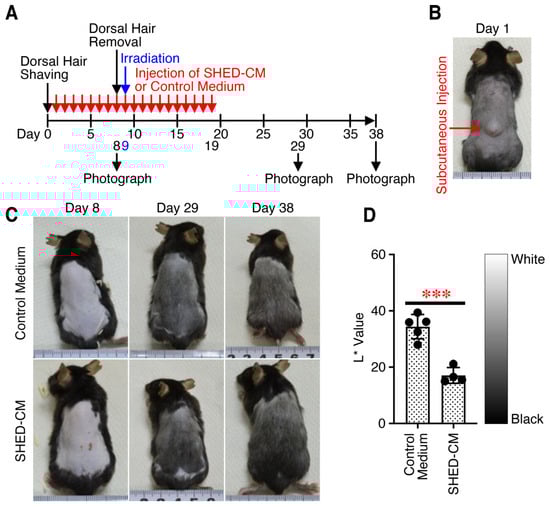 The hair graying mouse model was developed through X-ray irradiation of C57BL/6 mice after removal of dorsal hair, as reported previously (Figure 1A) [26]. Briefly, 6-week-old C57BL/6 mice were habituated for 1 week, and their dorsal hair was shaved at 7 weeks of age (day 0). Then, 100 µL of SHED-CM or control medium was subcutaneously injected into the dorsal skin from day 1 every day for 1 week. On day 8, the dorsal hair was removed by waxing, in order to induce the anagen hair cycle and, on day 9, the mice were irradiated with a 5 Gy X-ray dose. During this period, 100 µL of SHED-CM or control medium was subcutaneously injected into the dorsal skin every day from day 1 to day 19, and photographs of the dorsal area were taken with time. Hair blackness was assessed approximately 1 month after irradiation and quantified from each photograph with the CIELAB (CIE L*a*b*) color system [28] using Fiji (an expanded version of ImageJ, version 1.53c; National Institutes of Health). The L* value indicates hair brightness, from 0 (black) to 100 (white). The average L* value is shown as the result of the part of dorsal area where the administration was performed.