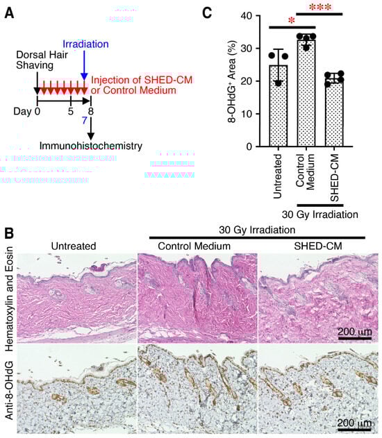 Multiple administrations of SHED-CM reduce ROS generation caused by X-ray irradiation in the skin. (A) Experimental time schedule for X-ray irradiation-caused hair graying and administrations of control medium or SHED-CM. (B) Dorsal skin tissues were removed on day 8 and immunohistochemically analyzed for expression of the oxidative stress marker 8-OHdG through counterstaining with hematoxylin and eosin. Representative photographs of their expression are shown. Subcutaneous adipose tissue, sebaceous gland, hair bulb, dermis, and epidermis were positively stained. (C) Positive areas for 8-OHdG were calculated using FIJI. Data are shown as the mean ± SD (n = 3–4) and are representative of three independent experiments. p-values were determined by one-way analysis of variance with the Tukey’s multiple comparisons test. * p < 0.05, *** p < 0.001.